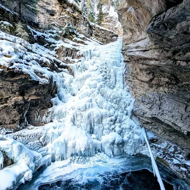 Ice Walk - Johnson's Canyon: Walk through Johnston Canyon to a world of frozen waterfalls and pillars of blue ice. During the ice walk you will learn about the formation of the canyon, pick out fossil corals in the rocks, and photograph the incredible pillars of ice as you walk through the canyon bottom and over suspended catwalks. Your professional guide leads you past waterfalls frozen in mid-stream, and through a short tunnel for a close up view of the Lower Falls.